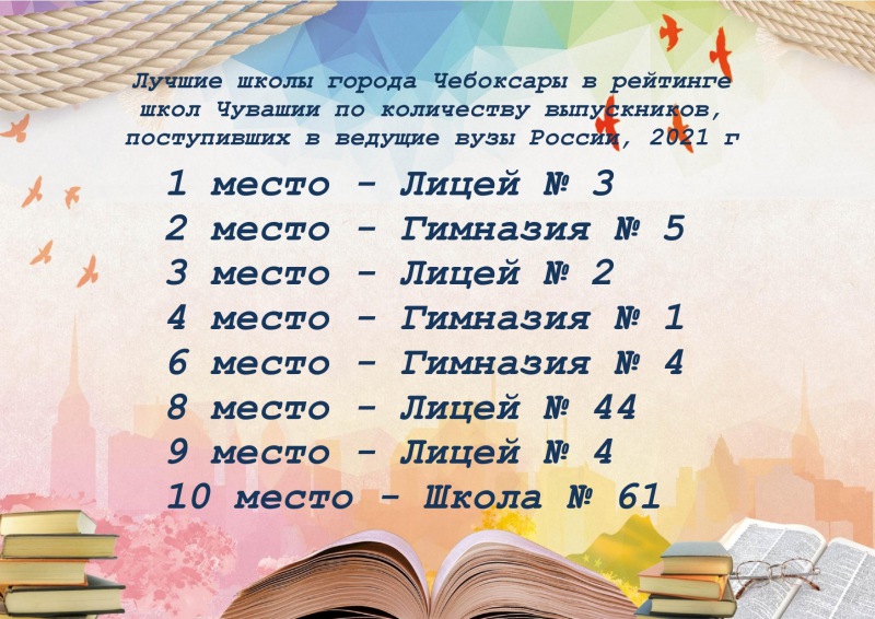 Как сообщает в своем пресс-релизе Управление образования администрации г. Чебоксары, в общероссийский список Топ-300 школ по количеству выпускников, поступивших в ведущие вузы России, вошли 4 образовательных учреждения города Чебоксары: