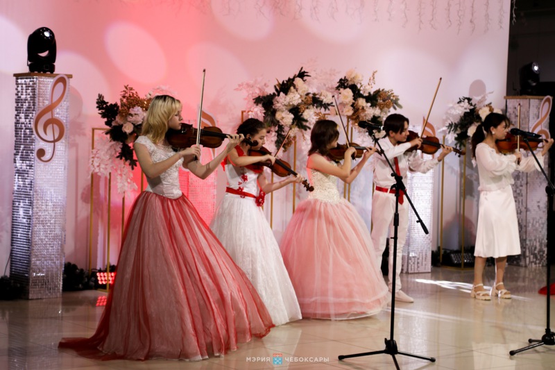 Торжественный вечер открыл ансамбль скрипачей "Калейдоскоп" - яркий творческий коллектив, известный далеко за пределами Чувашии. В этом году юные скрипачи стали участниками проекта-победителя конкурса грантов Главы Чувашии, яркий финал которого успешно прошел за несколько недель до юбилейного концерта.