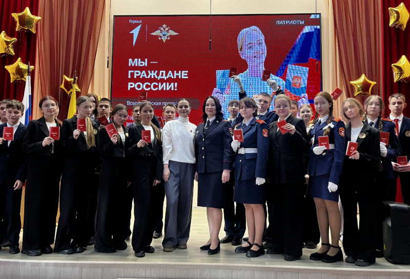 После исполнения гимнов России и Чувашии 52 школьника, достигших 14-летнего возраста, получили свои первые паспорта из рук заместителя начальника отдела по работе с гражданами Управления по вопросам миграции МВД по Чувашской Республике подполковника полиции Елены Егоровой и активистов регионального отделения "Движения Первых" Екатерины Евграфовой и Марии Михайловой.