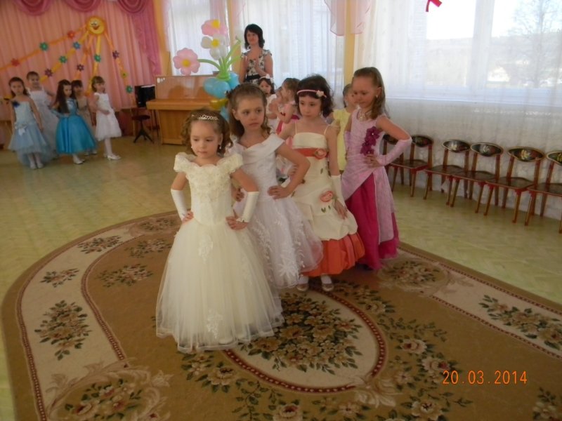 Еще до начала основного действа воспитанницы всех возрастных групп дефилировали под музыку в красивых бальных платьях. Почему только воспитанницы? Дело в том, что совсем недавно педагоги детсада провели рыцарский турнир для мальчиков. А теперь настала очередь принимать внимание зрителей на себя девочкам.