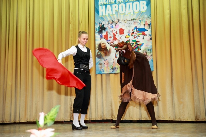 Первыми на сцену поднялись студенты психолого-педагогического факультета, представившие культуру Испании. Их выступление получилось насыщенным: в нем были и песни, и танцы, и «настоящая» коррида, и игра футбольного клуба «Барселона». А во время представления национального праздника «Война помидоров» над головами зрителей летали эти красные, спелые овощи, очень похожие на настоящие.