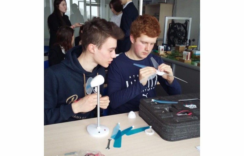 На занятии школьники собрали несколько действующих моделей ветроэнергетических установок, которые отличались количеством и длиной лопастей. В лабораторных условиях дети изучили принцип работы ветростанции, а также рассчитали зависимость КПД ветряной турбины от оптимального количества лопаток.