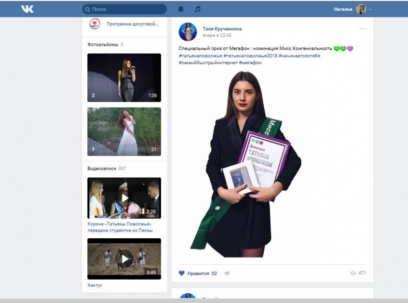 Впервые в межрегиональном студенческом конкурсе «Татьяна Поволжья» ввели диджитал-номинацию, в которой жюри учитывало активную работу участниц в социальных сетях. Первую победу в номинации одержала будущий строитель Татьяна Кручинкина из Мордовского государственного университета имени Н.П. Огарева.