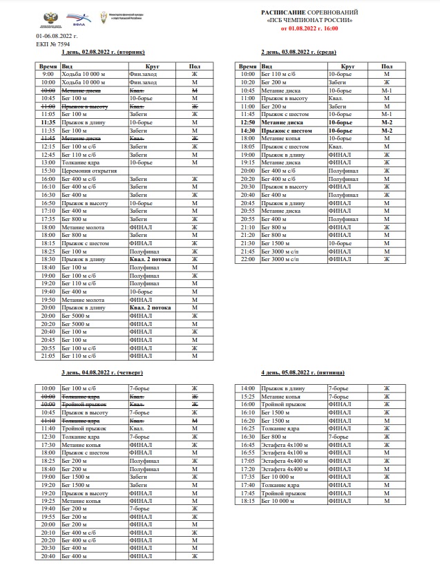 Торжественная церемония открытия чемпионата намечена на 2 августа в 15:30. Начало стартов в этот день - в 9:00, 3 и 4 августа - в 10:00, 5 августа - в 14:00.