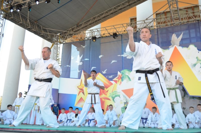С показательными номерами выступили представители десяти видов боевых единоборств - каратэ кёкусинкай, тайского бокса, ушу, кикбоксинга, сетокан, рукопашного боя, тхэквондо, керешу, самбо, кудо. Многочисленные зрители, среди которых было немало ветеранов и тружеников тыла, встречали всех участников акции бурными аплодисментами.
