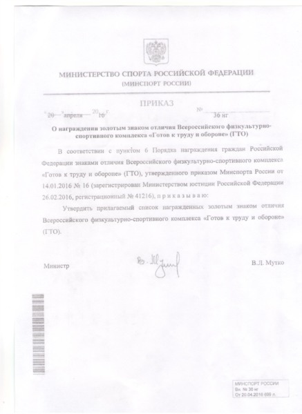 Приказом Минспорта Российской Федерации "О награждении золотым знаком отличия Всероссийского физкультурно-спортивного комплекса "Готов к труду и обороне" (ГТО)" утвержден список награждаемых золотым знаком отличия ГТО. Как сказано в пресс-релизе Управления физической культуры и спорта администрации города Чебоксары Чувашской Республики, в списке - 40 чебоксарцев.