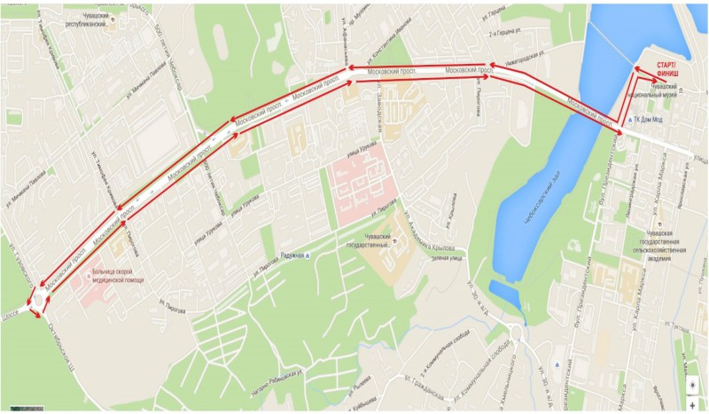 Велопробег пройдёт по маршруту: Красная площадь – Президентский бульвар – Московский мост – Московский проспект – кольцо "Роща" – Московский проспект – Президентский бульвар – Красная площадь (напротив Чувашского драматического театра).