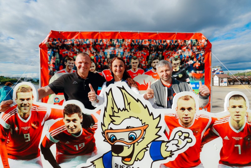 Для любителей селфи и памятных фото работают тематические площадки: клумба в виде футбольного поля, талисман Забивака, арт-объекты и огромные футбольные мячи.
