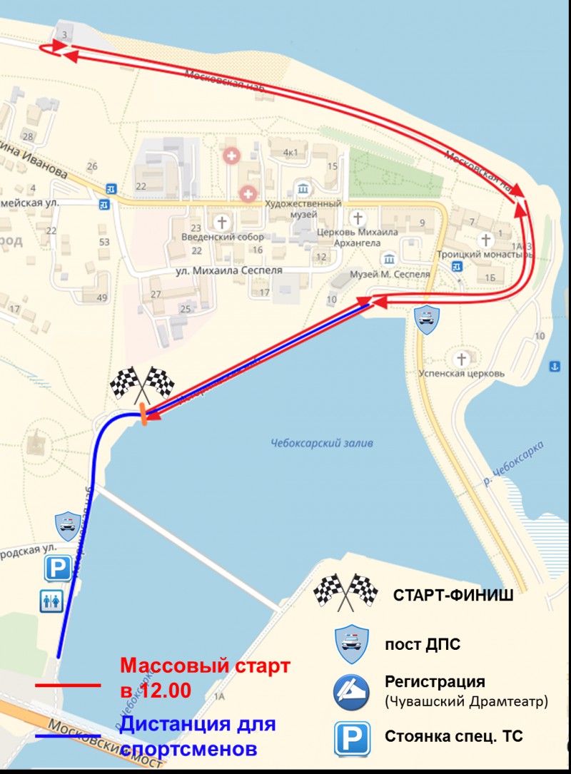 Центральный забег неизменно состоится на набережной Чебоксарского залива. Стартовая площадка разместится у подножия Монумента Матери-Покровительницы. Торжественное открытие мероприятия запланировано на 11.45, массовый старт – в 12.00 в районе Монумента Матери. Маршрут массового забега на 3 км пройдет по Московской набережной, а затем - в обратном направлении. Дистанция для спортсменов будет проходить в районе стартово-финишной зоны, без заходов на проезжую часть.