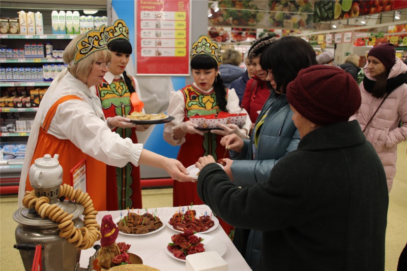 В гипермаркете "Магнит" конкурсную комиссию встретили сотрудники магазина в ярких народных нарядах со стихами о Масленице. Здесь развернулся стол с блинами для всех желающих. Горожане смогли отведать блины с икрой, с ветчиной и огурцами, а также сладкие блинчики с творогом. Красивым украшением стола стали красные блины-мешочки с мясной начинкой. "Тесто для этих блинов мы подкрасили свекольным соком - полезно и натурально", - рассказали сотрудники "Магнита".
