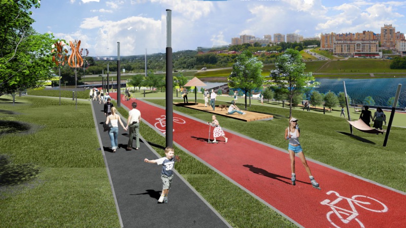 Спортивные зоны будут включать в себя обновленный амфитеатр-сцену, перголу, вейк-станцию. Предусмотрена отдельная площадка для отдыха детей и взрослых, раздевалки, прокат инвентаря, площадки для воркаута, волейбола, баскетбола, мини-футбола.