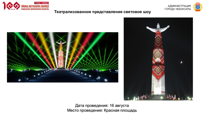 В День города Чебоксары, 16 августа, в центре столицы объединятся два масштабных проекта - "Таван Атал" и "Творческий бульвар", а вечером на обновленной Красной площади состоятся главные мероприятия: театрализованное представление, выступление звезд эстрады, световое и лазерное шоу.