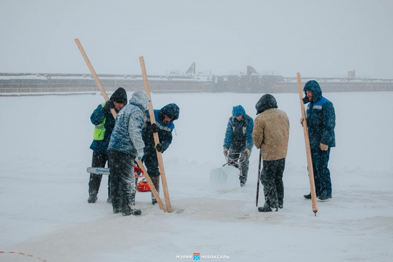 Инженерная защита уже выполнила комплекс подготовительных работ. Вчера вырублены проруби, после проверки на прочность в них установлены деревянные конструкции (перила, лестницы, основания и боковины). Глубина воды в купелях будет не более 1 метра 30 см.