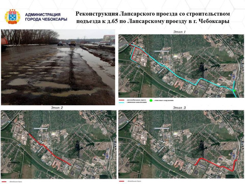 Реконструкция Лапсарского проезда. В 2022 году планируется начать реализацию 1 из 3 этапов. Он включает в себя участок, примыкающий к региональной автодороге "Чебоксары-Сурское", до ПК8 - здания № 49 по Лапсарскому проезду и подъезд к д. 65 (подъезд к заводу ОБД и Таможне). Сумма, предусмотренная на 2022 год - 84 млн рублей.