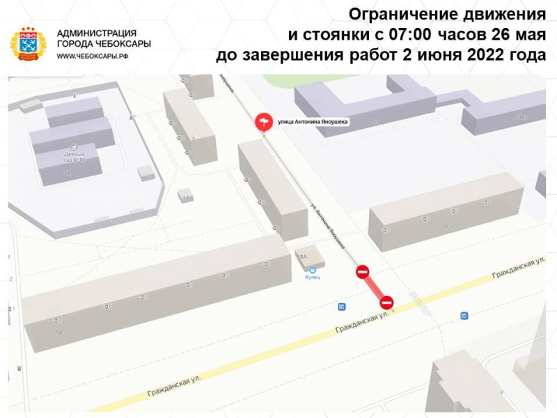Для выполнения дорожно-строительных работ ограничивается движение на съезде с ул. Гражданская на ул. Яноушека. Ограничение действует неделю: с 26 мая (четверг) с 7:00 и до завершения работ 2 июня (четверг). Об этом сообщается в пресс-релизе, опубликованном на сайте Управление ЖКХ, энергетики, транспорта и связи администрации г. Чебоксары.