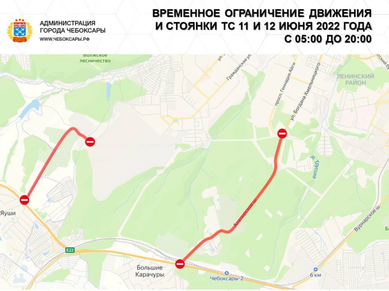 11, 12 июня будет ограничено движение и стоянка транспортных средств с 5:00 до 20:00, кроме общественного транспорта, по Алатырскому шоссе от перекрестка ул. Богдана Хмельницкого - пр. Геннадия Айги до железнодорожного переезда дер. Большие Карачуры на 646 км автодороги М-7 "Волга", автодороге от дер. Яуши до ПО им В.И. Чапаева по ул. Кирова города Чебоксары.