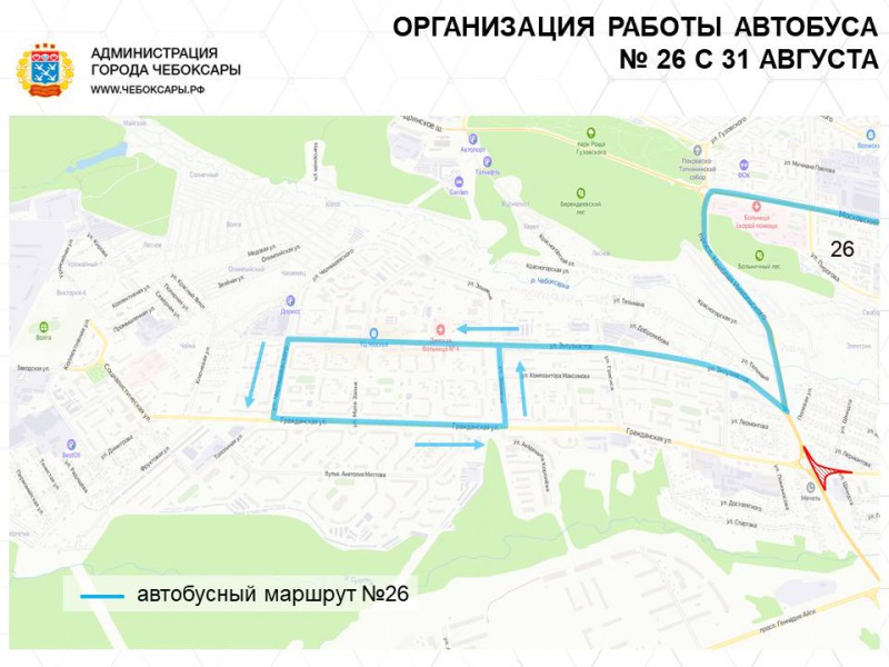 Автобусный маршрут №26 будет следовать по схеме: ул. Энтузиастов - ул. Чернышевского - ул. Гражданская - ул. Эльменя - ул. Энтузиастов и далее по существующей схеме.