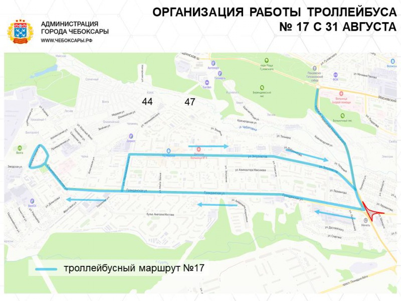 Троллейбусы маршрута № 17 при следовании из северо-западного района будут следовать по ул. Гражданская до конечной остановки. В обратном направлении: ул. Социалистическая - ул. Чернышевского - ул. Энтузиастов и далее по существующей схеме.