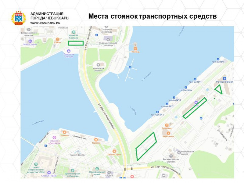 Места стоянок транспортных средств вблизи обустроенных купелей будут предусмотрены по следующим адресам: нижняя площадка пл. Речников, в районе д. №1,3 по пл. Речников, в районе памятника Екатерины, в районе памятника Петра и Февронии.