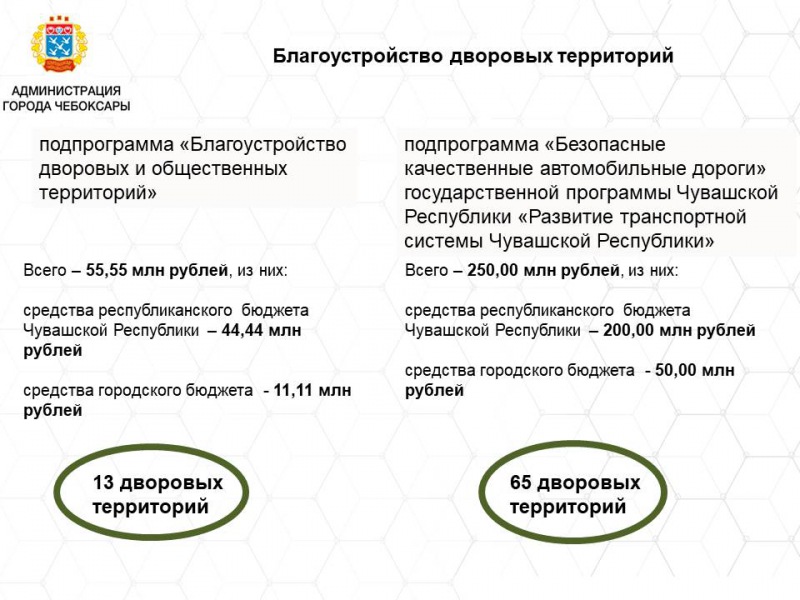 На реализацию мероприятий подпрограммы "Благоустройство дворовых и общественных территорий муниципальных образований Чувашской Республики" программы "Формирование современной городской среды на территории Чувашской Республики" выделяется 250 млн рублей из республиканского и муниципального бюджетов. На эти средства будет выполнено благоустройство по 20-ти адресам, которые включают в себя 65 дворовых территорий у 76 многоквартирных домов, в которых проживают 24,7 тысячи чебоксарцев.