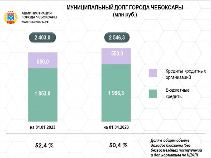 Объем муниципального долга по состоянию на 1 апреля 2023 года составил 2,54 млрд рублей, или 50,4 % от утвержденного общего объема доходов бюджета города Чебоксары (без учета безвозмездных поступлений и поступлений НДФЛ по дополнительным нормативам). По сравнению с началом года муниципальный долг вырос на 143,3 млн рублей.