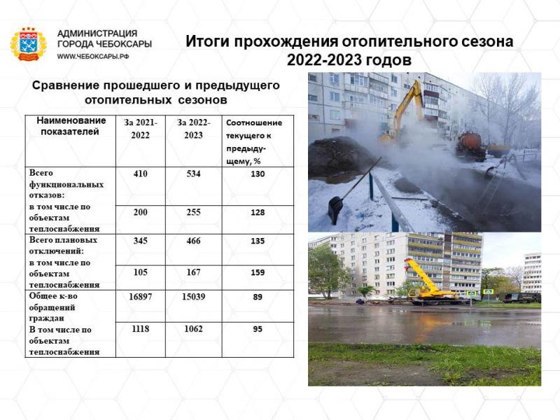 Как отметил заместитель главы администрации г.Чебоксары по вопросам ЖКХ Александр Федоров, отопительный сезон прошел в штатном режиме без особых проблем и серьезных технологических отказов. Аварийные ситуации на инженерных сетях устранялись в нормативные сроки. С начала отопительного сезона на сетях произошло 534 функциональных отказа, в т.ч. 255 - по системе теплоснабжения. В ЕДДС и аварийно-диспетчерские службы поступило 15 039 обращений, в том числе 1061 из них касались вопросов теплоснабжения (7%). По всем обращениям были приняты оперативные меры реагирования, нарушения устранены в сжатые сроки.