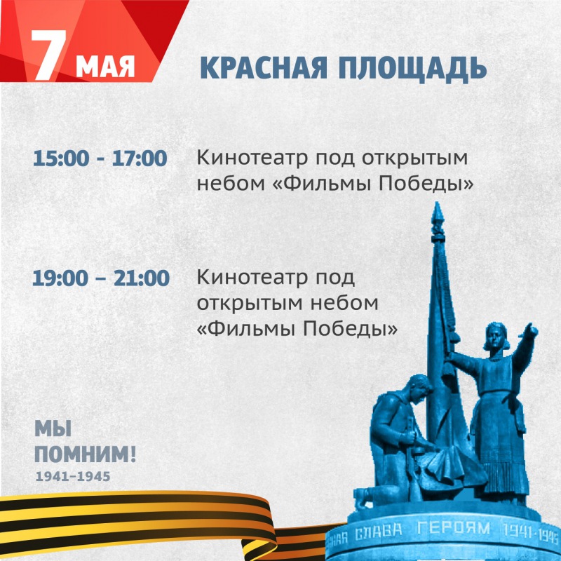 7 мая с 15.00 до 17.00 часов и с 19.00 до 21.00 часов будет работать кинотеатр под открытым небом "Фильмы Победы". В перерывах пройдут репетиции театрализованного концерта "Песни Великой Победы".