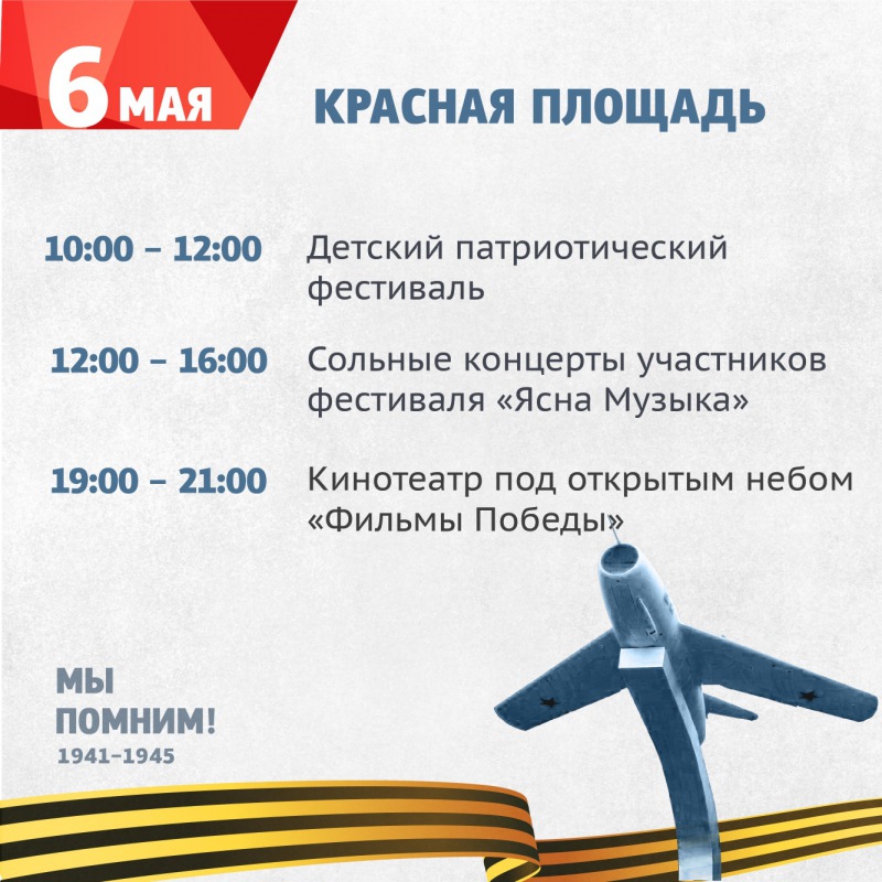 6 мая с 10.00 до 12.00 часов пройдет Детский патриотический фестиваль, с 12 до 16 часов пройдут сольные концерты фестиваля "Ясна Музыка". С 19.00 до 21.00 часа на Красной площади начнет работу кинотеатр под открытым небом "Фильмы Победы".