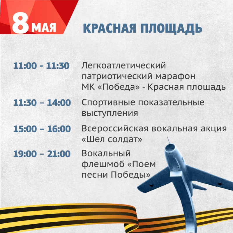 С 11.30 до 14.00 пройдут спортивные показательные выступления. С 15.00 до 16.00 часов состоится всероссийская вокальная акция "Шел солдат" С 19 до 21 часа пройдет вокальный флешмоб "Поем песни Победы".
