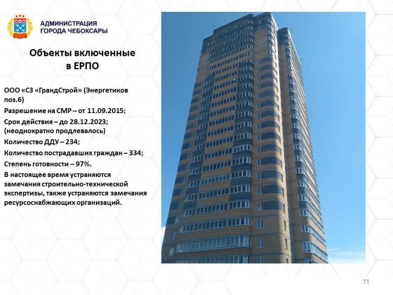 9 объектов в столице Чувашии в настоящее время включены в Единый реестр проблемных объектов, это недострои ООО "Победа", улица Калинина, позиция 83; ООО "Алза", проезд Соляное (поз.5); ООО "Фирма, "Старко" площадь Речников, 7; ООО "Альянс-Недвижимость", ул. Гагарина, поз. 5; ООО "СЗ "Лидер" "Кувшинка", поз. 3;3а; ООО "СЗ "Лидер" "Кувшинка", поз.19; ООО "СЗ "Лидер", ул. Гагарина поз. 1; ООО "СЗ "Лидер", ул. Гагарина поз. 2; ООО "СЗ "ГрандСтрой", "Алые паруса" поз.6, 6а.