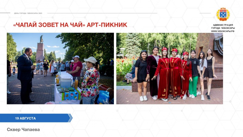 19 августа праздничные мероприятия были организованы на Красной площади, Чебоксарском заливе, в сквере Чапаева, на стадионе "Спартак".