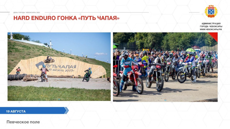 Марафон событий, приуроченных к празднованию 554-го дня рождения Чебоксар стартовал в середине июля, всего проведено более 250 тематических акций, фестивалей, конкурсов, спортивных и культурных мероприятий, посвященных Дню города, в них принял участие каждый второй горожанин.