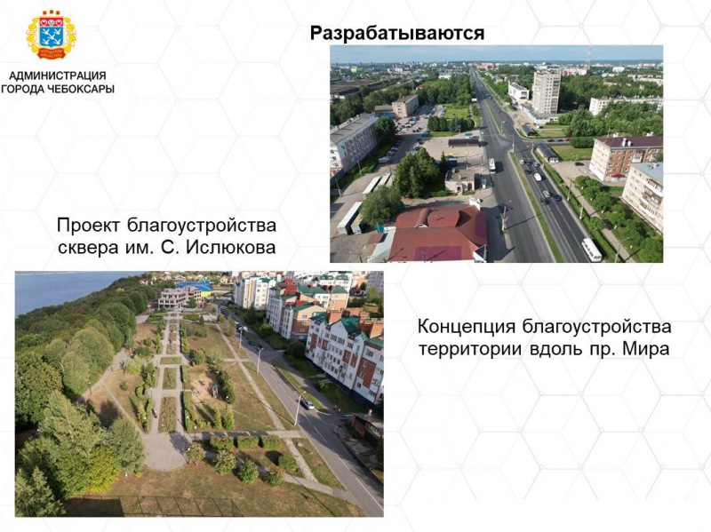 Также разрабатываются проект на благоустройство сквера им. С. Ислюкова и концепция благоустройства территории вдоль пр. Мира, в 2024 году планируется разработка проектов на благоустройство сквера И. Яковлева и территории вдоль пр. Мира.