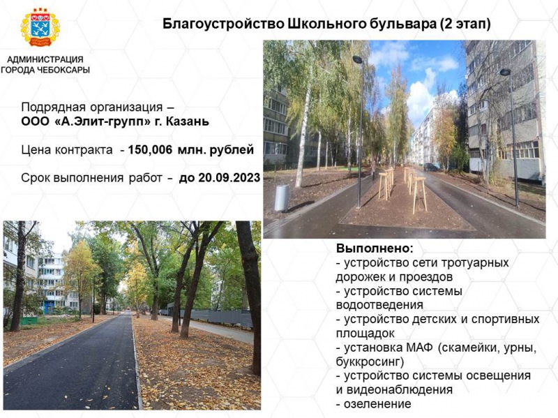 2. Благоустройство Школьного бульвара (2 этап) - 150,01 млн рублей. Подрядчик - ООО "А.Элит-групп" (г. Казань). Выполнено благоустройство сквера с устройством сети тротуарных дорожек и проездов; устройство системы водоотведения; устройство детских и спортивных площадок; обустройство сквера малыми формами (скамейки, урны, буккросинг); система видеонаблюдения; наружное освещение; озеленение. Работы завершены на 98%. За нарушение графика на подрядчика будут наложены штрафы.