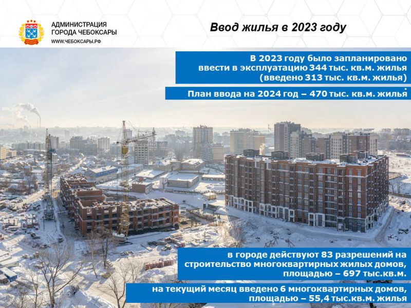 В 2023 году в Чебоксарах введено в эксплуатацию 313 тыс. кв.м жилья (30 многоквартирных жилых дома площадью 247 тыс. кв.м и 352 индивидуальных жилых домов площадью 65,8 тыс. кв.м), это 91% от запланированных показателей.