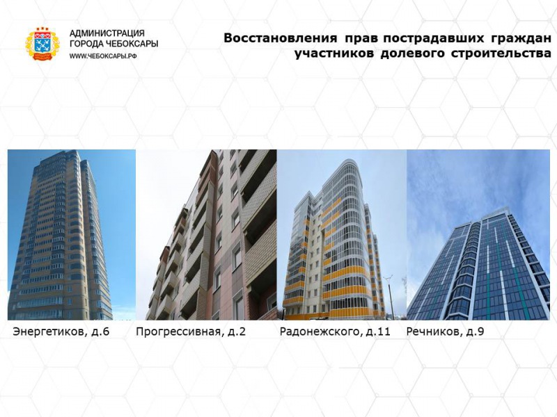 Правительством РФ, Главой Чувашской Республики поставлена задача до конца 2023 года по ликвидации проблемных объектов и восстановления прав пострадавших граждан участников долевого строительства. В результате проведенной совместной работы администрации г. Чебоксары, Минстроя ЧР, прокуратуры г. Чебоксары, НО "Фонд защиты прав дольщиков в ЧР" в 2023 введены в эксплуатацию следующие проблемные объекты: