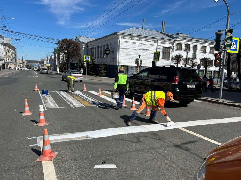На проезжей части центральных дорог идет нанесение разметки - разделительных осевых и пешеходных переходов. Работы производятся как устойчивым термопластиком, так и краской.