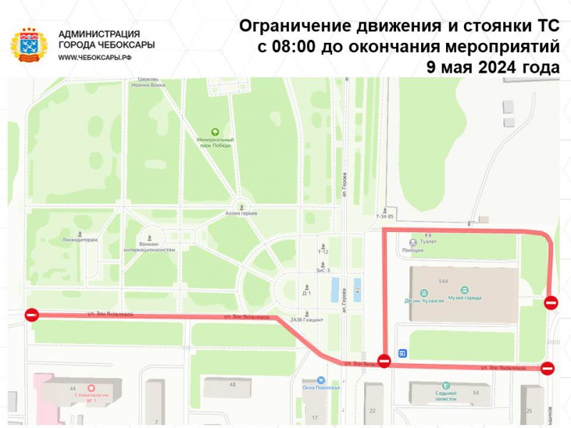 9 мая с 08:00 часов и до окончания массовых мероприятий в столице Чувашской Республики ограничивается движение и стоянка транспортных средств по Президентском бульвару от пересечения с ул. К. Воробьёвых и ул. Ленинградской от пересечения с К. Воробьевых. Об этом сообщается в пресс-релизе Администрации г. Чебоксары Чувашской Республики.