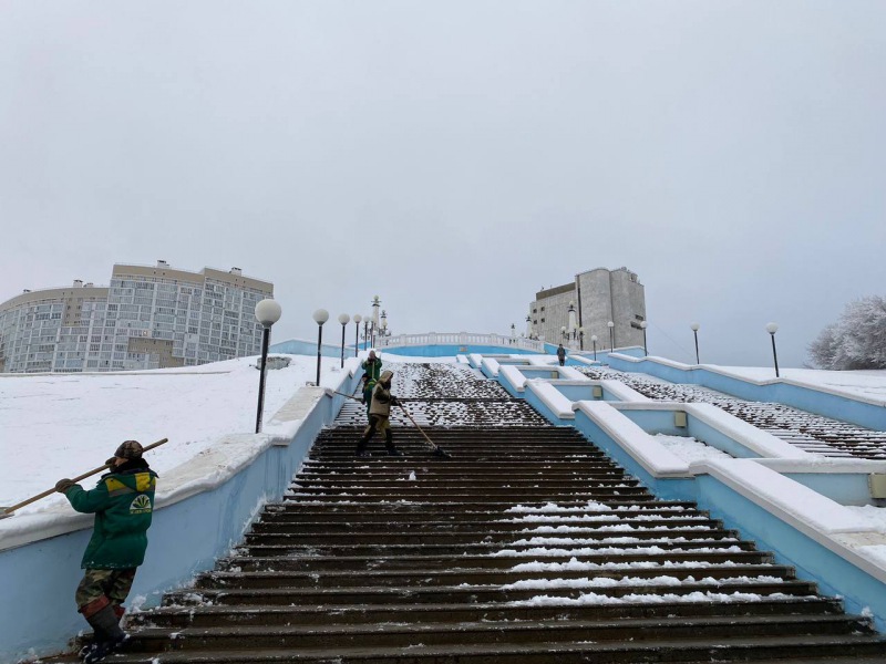 Специалистами подрядных организаций были убраны: Красная площадь, лестница и площадка у Дома Правительства, скверы у Национальной библиотеки, на Площади республики и в МКР "Новый город", лестницы на территории частных секторов и лестничные сходы на Певческом поле. От снега была очищена площадь размером более 82 тысяч кв. м.