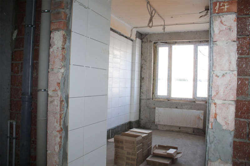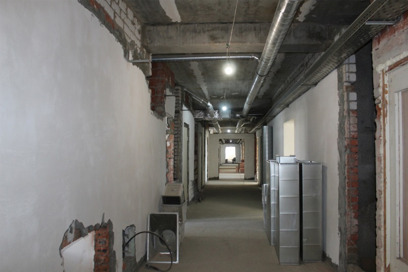 На третьем, втором и первом этажах была проведена замена электропроводки, установлены новые розетки и распределительные коробки. Установлены воздуховоды для приточной и вытяжной вентиляции. Кроме того, была выполнена черновая отделка стен и потолков, а также проведена стяжка. Уложена кафельная плитка в коридорах и санузлах. Далее планируется чистовая отделка стен и потолков.