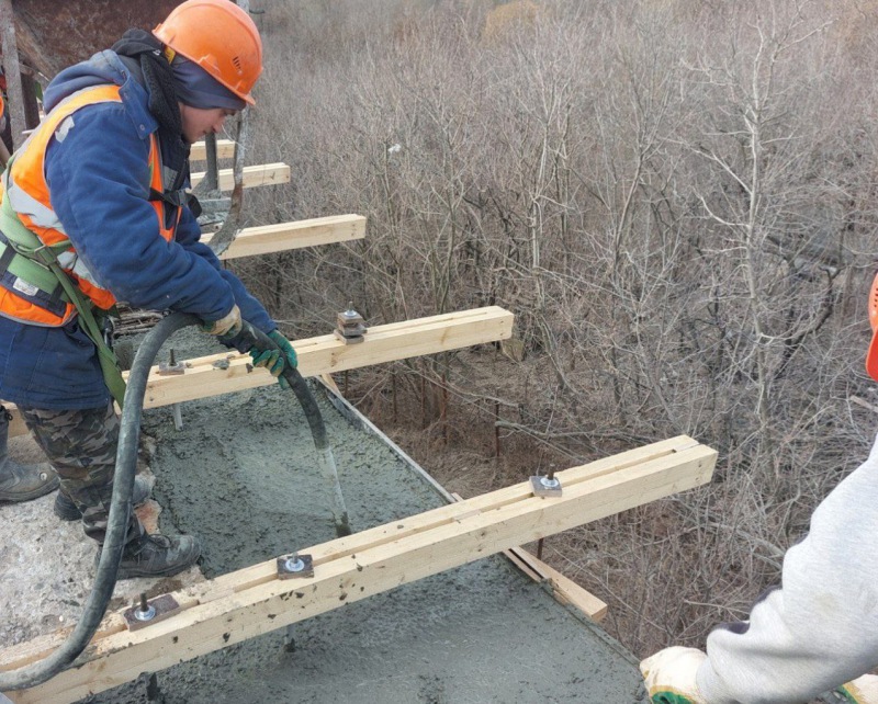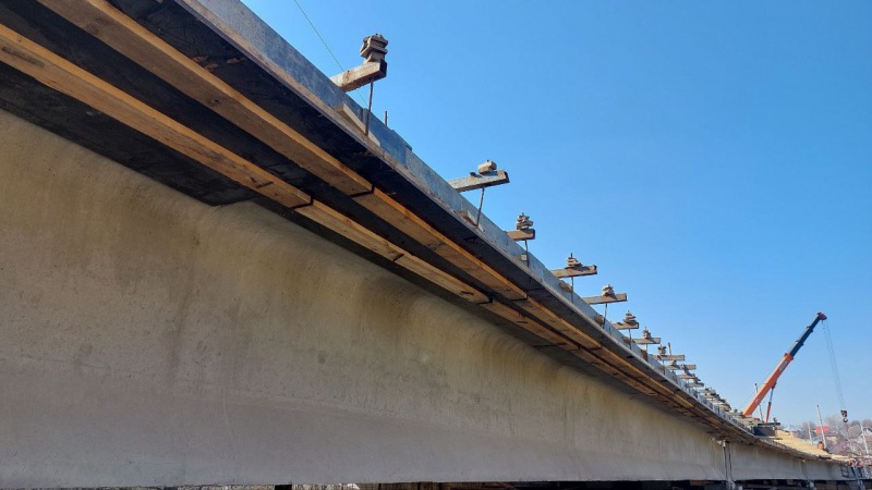 Дополнительно сообщаем, что на мосту проводится устройство арматурного каркаса монолитной консоли (работы выполнены с 1 по 13 пролеты), ведется бетонирование открылка 13 опоры, а по 1 опоре ведутся работы по демонтажу открылка. Также идет устройство выравнивающего строя. Завершена заливка монолитной консоли на трех пролетах.