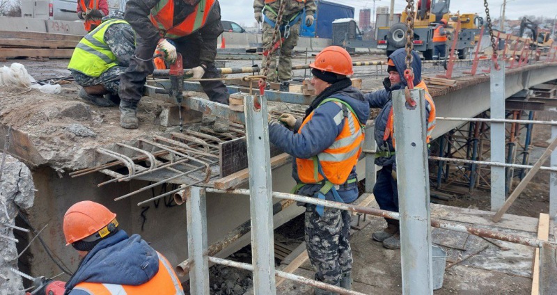 В настоящее время на правой половине моста завершены демонтажные работы по верхней части, закончено переустройство контактной сети и организовано временное движение автотранспорта. Ведутся работы по береговым опорам №1, 13. Проведена замена подферменников и опорных частей, также произведен подъем и опускание балок пролетного строения. По промежуточным опорам №2-12 по опорам № 2, 3, 4, 5, 7, 9, 11 завершены работы по замене подферменников и опорных частей, также произведен подъем и опускание балок пролетного строения. По остальным опорам ведутся подготовительные работы для устройства опорных частей.
