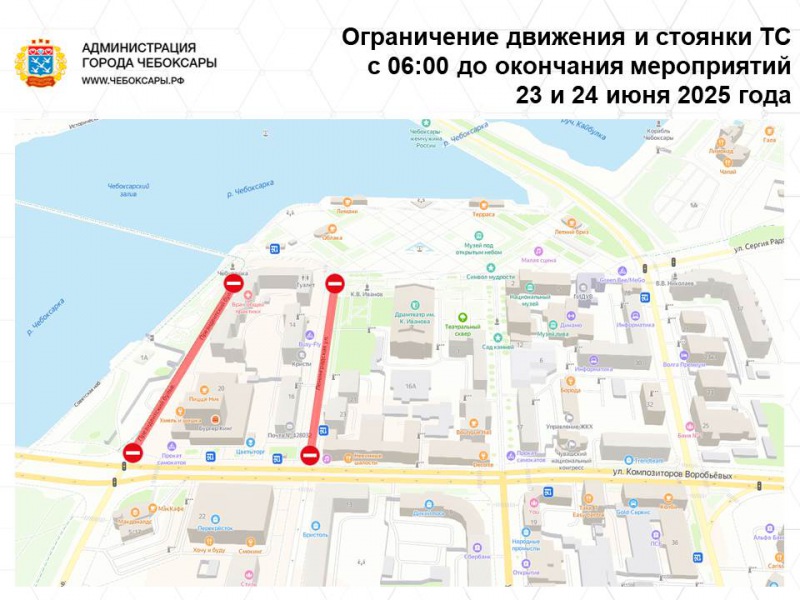С 06:00 час. 23-го (понедельник) и 24-го (вторник) июня и до окончания массовых мероприятий, приуроченных к празднованию Дня Чувашской Республики, ограничивается движение и стоянка транспортных средств по Президентском бульвару от пересечения с ул. К. Воробьёвых и ул. Ленинградской от пересечения с Композиторов Воробьевых.