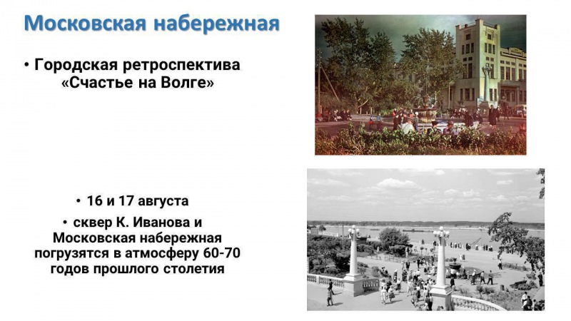 Впервые на Московской набережной пройдет ретроспектива 60-70-х годов.Здесь будет воссоздана атмосфера тех лет: фонтан, как на старых фото, модное дефиле, ностальгические мелодии, которые так любят горожане; фестиваль «Джаз на Волге».