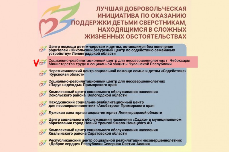Добровольцы из Чувашии признаны лучшими на всероссийском уровнеНа днях организационный комитет Всероссийской акции «Добровольцы — детям» определил 30 организаций - лидеров, среди которых - столичный Социально-реабилитационный центр для несовершеннолетних. БУ «Социально - реабилитационный центр для несовершеннолетних г. Чебоксары» Минтруда Чувашии стал одним из лучших в номинации «Добровольческая инициатива по оказанию поддержки детьми сверстникам, находящимся в сложной жизненной ситуации».