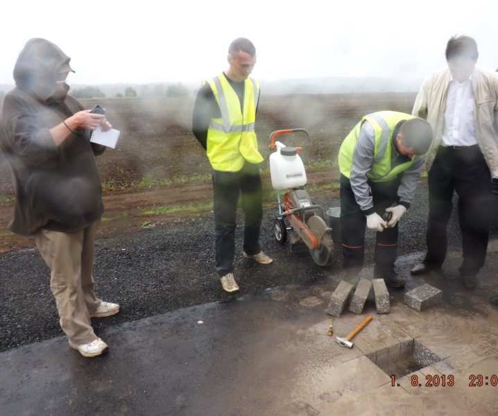 На данной автомобильной дороге сегодня специалистами дорожной лаборатории Управления автомобильных дорог Чувашской Республики с целью проверки качества дорожного полотна на объездной автодороге в обход города Новочебоксарска к полигону ТБО на первом километре первого участка произведена контрольная вырубка нового асфальтобетонного покрытия. Сейчас проводится формование образцов и в течение 3 суток будут проведены лабораторные испытания. Дорожная передвижная лаборатория Чувашупрдор обеспечена испытательным оборудованием, средствами измерений, приспособлениями, инвентарём. На базе автомобиля ГАЗ 2705 она оборудована для своевременного отбора контрольных проб, образцов, выездов с целью проверки качества выполняемых работ. Специалисты лаборатории заведующий сектором лабораторного контроля С. Степанов и ведущий эксперт А. Игнатьев еженедельно проводят испытания щебня, песка и асфальтобетона на физико-механические показатели. Первого августа выполнена работа по отбору контрольных проб дорожного плотна на объездной автомобильной дороге в обход города Новочебоксарска к полигону ТБО с последующим оформлением результатов испытаний. По итогам испытаний в случае обнаружения специалистами нарушений, отклонений от нормативно-технической и сметной документации руководство учреждения, кураторы муниципальных районов республики будут официально проинформированы о нарушениях. Претензии дорожных контролёров могут касаться как асфальтобетонных смесей, так и технологии выполнения работ на всех стадиях технического процесса.
