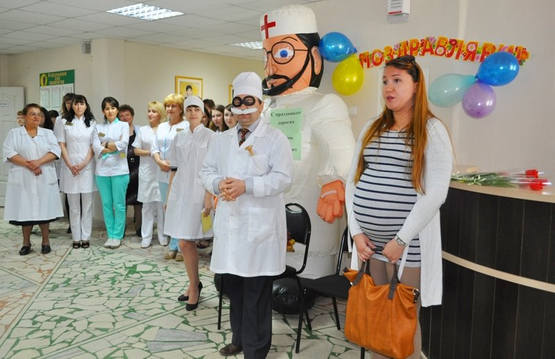 А в женской консультации оригинальное поздравление акушеркам преподнес импровизированный доктор Айболит в лице заведующего женской консультацией Мыцикова Александра Витальевича, который выразил искренние слова благодарности и теплые пожелания в адрес виновников торжества и вручил полезный подарок – корзину фруктов. Врачи-акушеры-гинекологи и пациенты, в свою очередь, выстроив живой коридор, поздравили акушерок аплодисментами и вручили открытки с цветами в честь праздника.