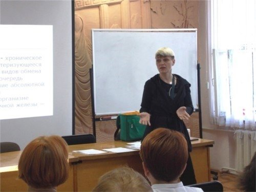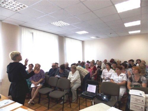 В актовом зале поликлиники собрались пациенты с сахарным диабетом, члены их семей, а также медицинские работники – врачи первичного звена - врачи общей практики, участковые медицинские сестры, сотрудники кабинетов медицинской профилактики. Надо отметить, что среди слушателей сегодня присутствовали беженцы из Украины.