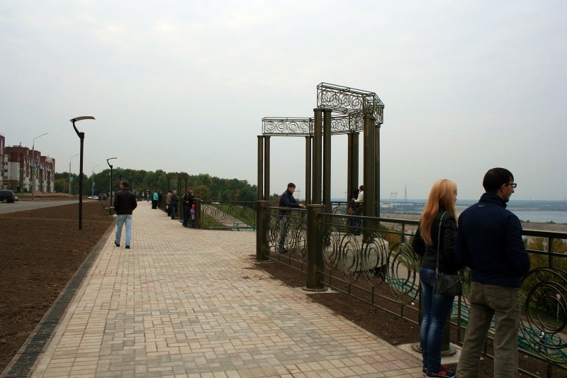 Много людей сегодня на обновленной набережной. Ее теперь не узнать: вдоль склона замощеная дорога, установлены декоративные перила и оригинальные фонари, возведены ротонды. Теперь не придется прогуливаться по голой земле, пачкаясь и рискуя оступиться. Совершать прогулки по берегу Волги - одно удовольствие.