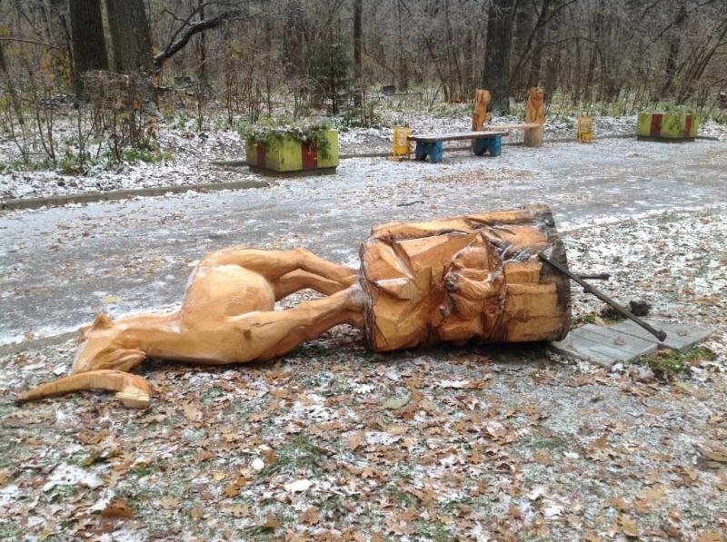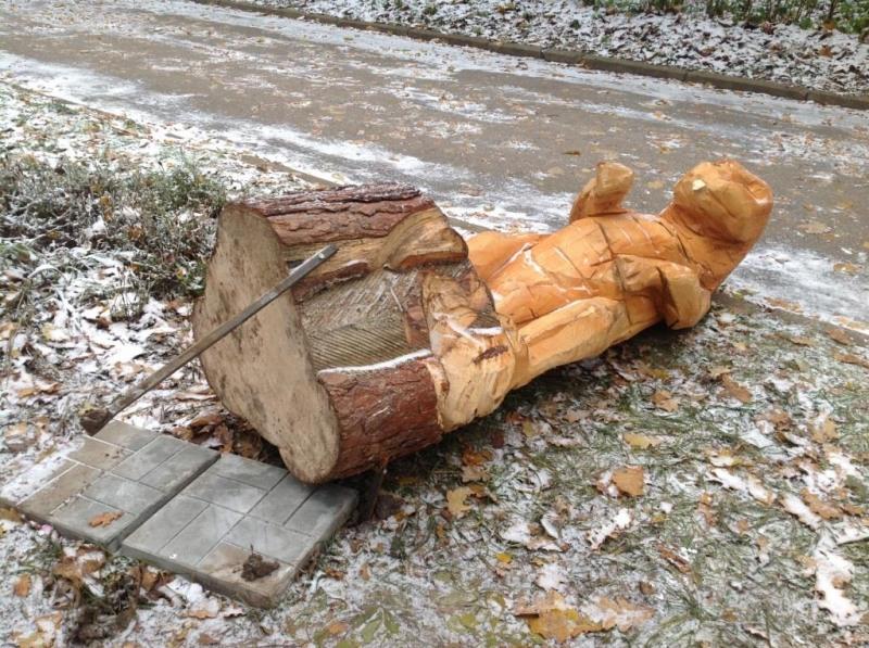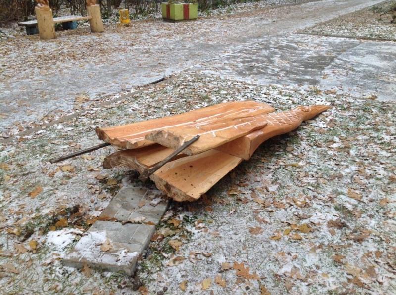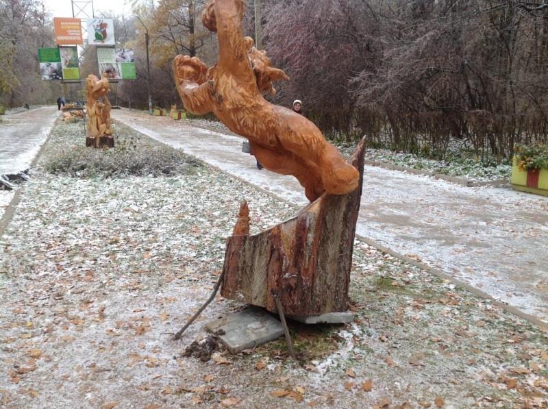 Однако в ночь с 18 на 19 октября группа вандалов уронила и частично поломала 6 фигур из 10. Оставшиеся 4 скульптуры хулиганы также пытались уронить, но не смогли. На них покорежены металлические крепления, здесь также требуется восстановление.